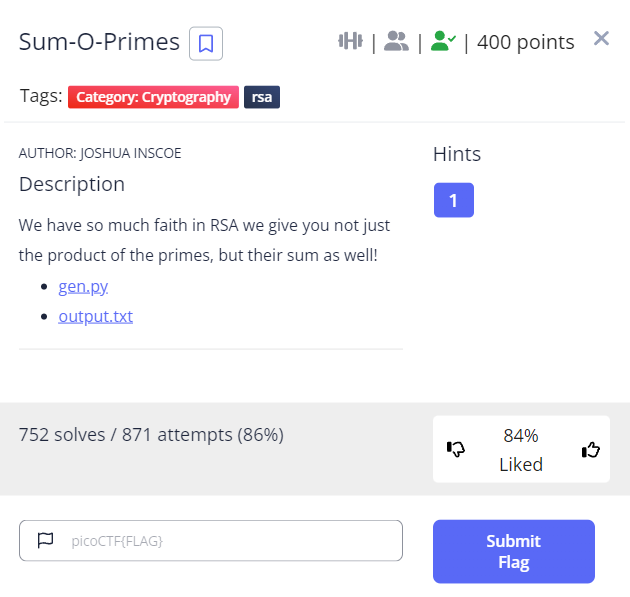 output 으로는 소수 p, q 의 합인 x, Public Modulus 인 n, 암호문 c 를 제공해주고 있습니다.
